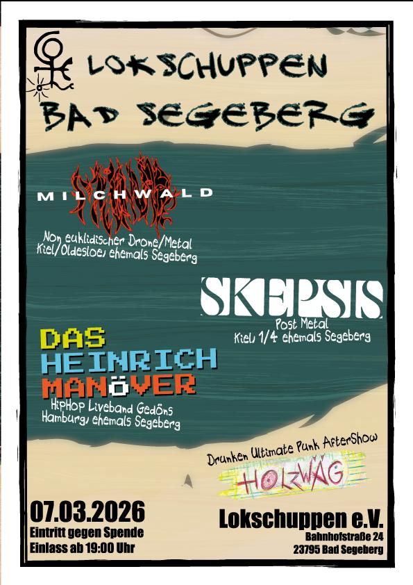 Einige der profiliertesten Segeberger Musiker:innen kehren mit ihren aktuellen Kapellen in den guten, alten Lokschuppen zurück: Stätte ihrer musikalischen Sozialisation, Ort, an dem sie probten, lachten, sangen, Zeit verbrachten (besonders nachdem das HAK zum Parkplatz gemacht ward), Ort, an dem sie feierten und Konzerte spielten.